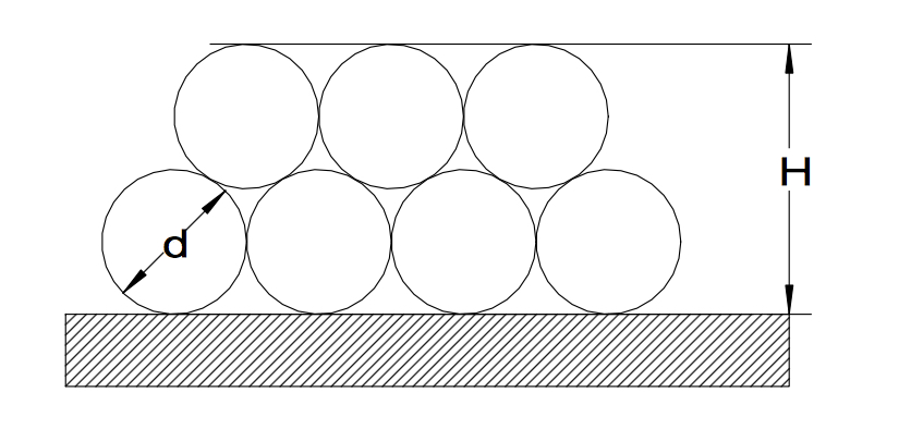 Центры трёх любых соприкасающихся кругов образуют равносторонний треугольник со сторонами в d. Высота такого треугольника - d√3/6 (поскольку равна (d/2)*ctg60°). Если провести из центра любого верхнего и нижнего кругов радиус в точку касания с верхней и нижней прямой (который, радиус, как известно, перпендикулярен касательной), то получаем полное расстояние, равное