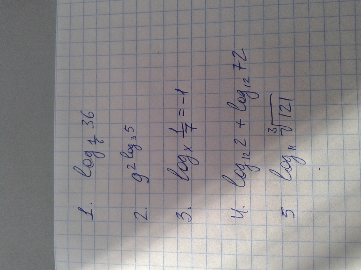 1.;log_{frac16}36=log_{6^{-1}}6^2=frac2{-1}log_66=02cdot1=-2\2.;9^{2log_35}=left(3^2right)^{2log_35}=3^{4log_35}=3^{log_35^4}=3^{log_3625}=625\3.;log_xfrac17=-1\log_x7^{-1}=-1\-log_x7=-1\log_x7=1\x^1=7\x=1\4.;log_{12}2+log_{12}72=log_{12}(2cdot72)=log_{12}144=log_{12}12^2=2\5.;log_{11}sqrt[3]{121}=log_{11}121^{frac13}=frac13log_{11}(11)^2=frac13cdot2=frac23