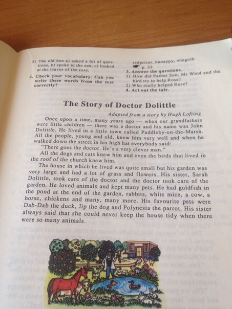 Однажды много лет назад когда наши дедушки были детьми жил доктор и его звали Джон Долитл. Он жил в маленьком городке под названием ___. Все люди , маленькие и большие, знали его очень хорошо и когда он гулял по улице в своей высокой шляпе, каждый говорил : Вот идет доктор. Он очень умный человек. Все собаки и кошки знали его и каждая птица которая жила на крыше церкви знала его. Дом в котором он жил был довольно маленьким но его сад был очень большим и в нем было много травы и цветов. Его сестра Сара Долитл, заботилась о докторе и доктор заботился о саде. Он любил животных и держал много домашних животных. У него были золотая рыбка в пруду в конце сада, кролики , белая мышь , корова, лошадь, курицы и много много других. Его любимым животным быи утка Даб-Даб, собака Джип, попугай Полинезия. Его сестра всегда говорила что она никогда не сможет содержать дом в порядке когда там так много животных