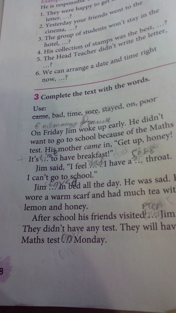 " Джим сказал: Плохо себя чувствую - горло болит. Не могу идти в школу.