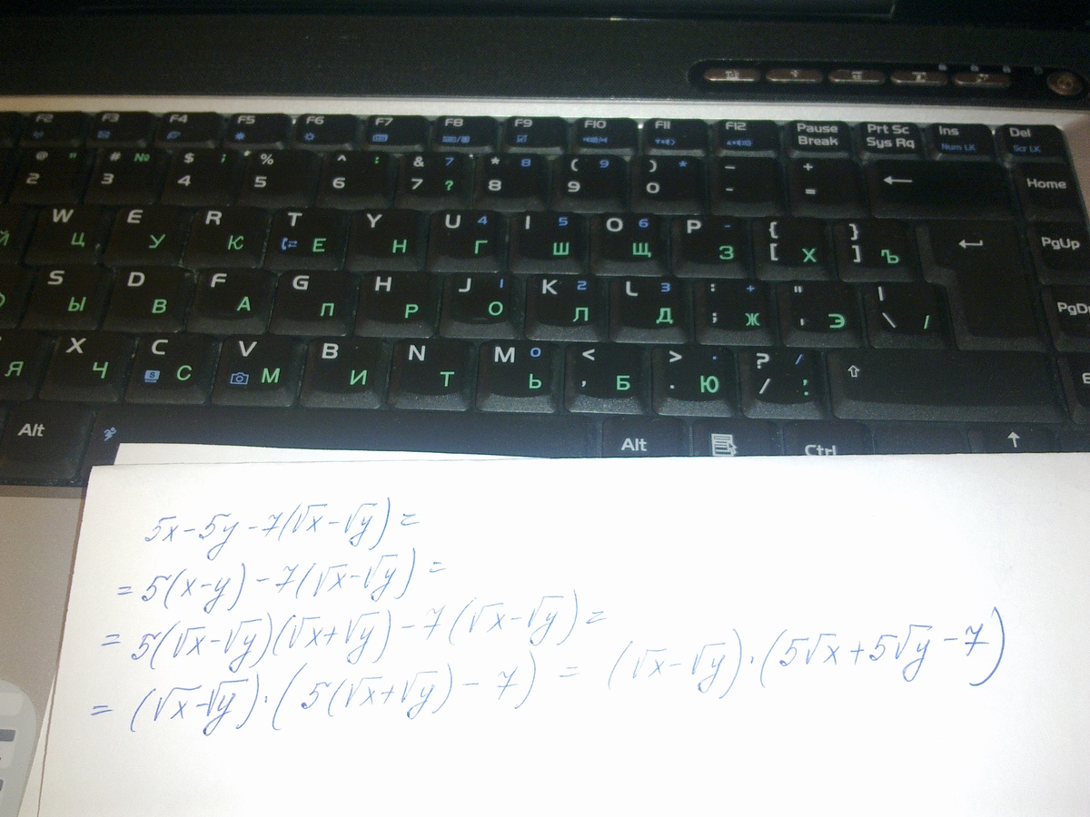 5(x-y) - 7( √x - √y )= 5( √x - √y)( √x+ √y) -7( √x - √y)= ( √x - √y)( 5( √x + √y) -7)
