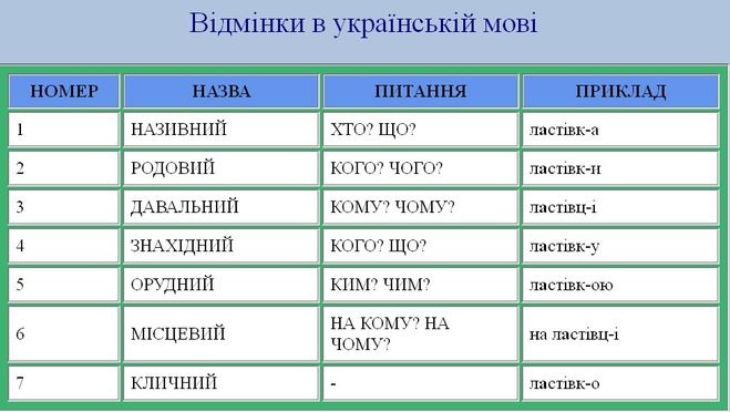 Називний відмінок (хто? Що?) земля! Род відм (кого? Чого) землі! Давальний відм (кому? Чому?) землі! Знахідний (кого? Що?) землю! Орудний (ким? Чим) землею! Місцевий ( на кому? На чому?) на землі ! Кличний - земле! Н. В - школа! Р в - школи! Д в - школі! З в - школу! О в - школою! М в - на школі! Кличний - школо!