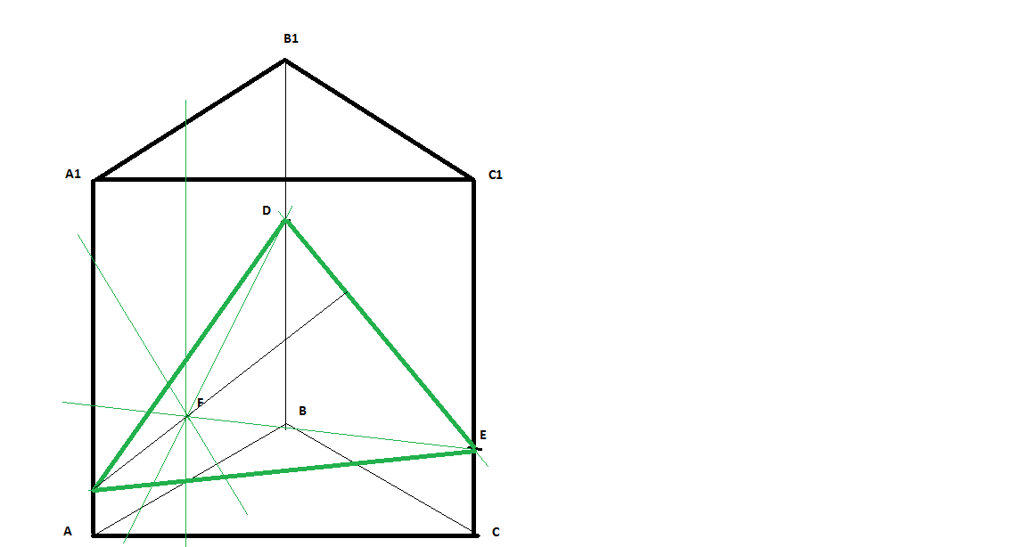 17. Дана прямая треугольная призма A…C1. Проведите сечение через точкиD, E, принадлежащие соответственно ребрам BB1,CC1 и точку F – внутреннюю точку призмы. РИСУНОК , ПОЯСНЕНИЕ