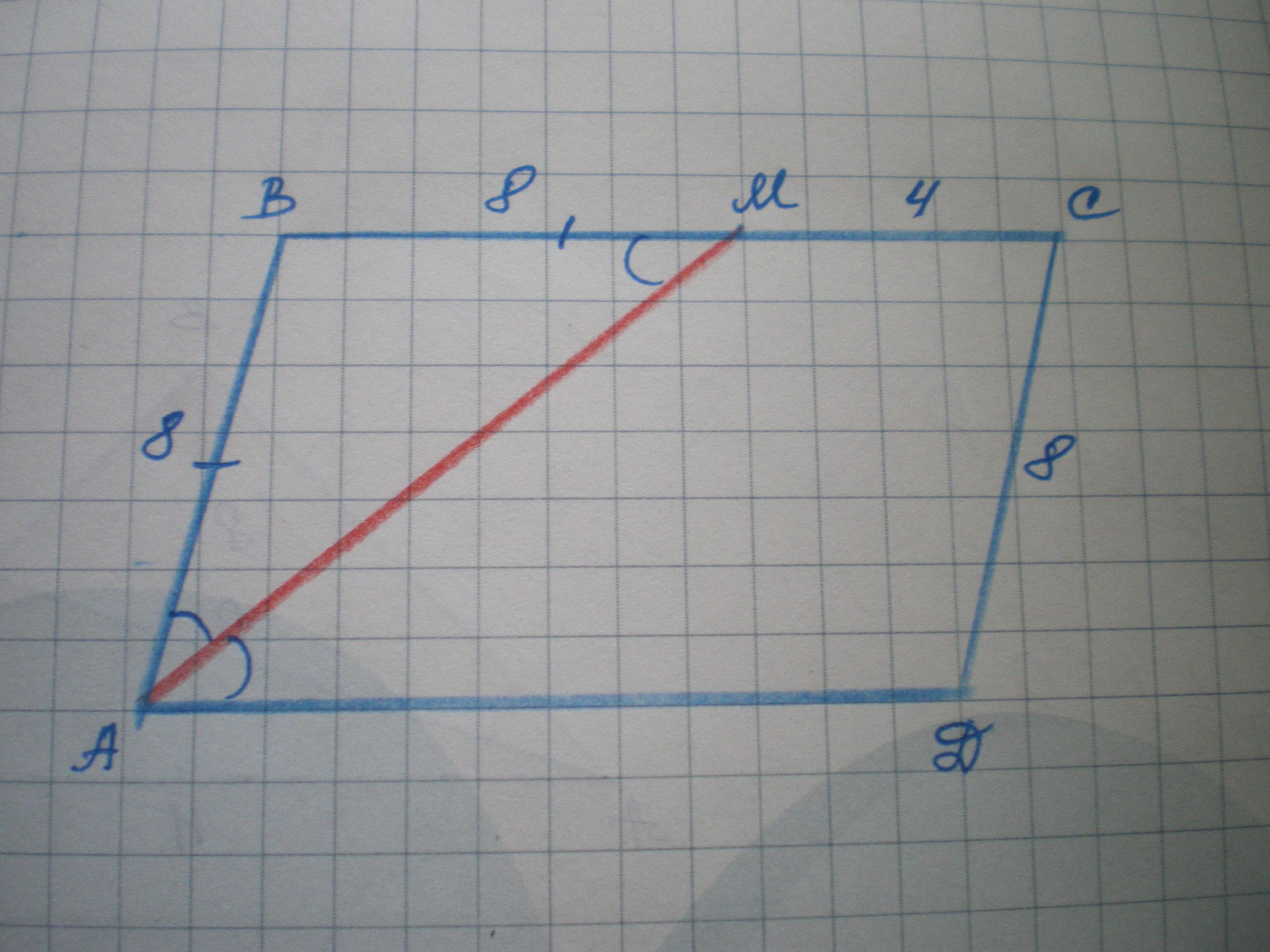 НИКТО НЕ МОЖЕТ РЕШИТЬ!!!! на стороне bc параллелограмма abcd выбрана точка M так,что AB=BM докажите a)что AM-биссектриса угла BAD b) найдите периметр параллелограмма,если CD=8см,CM=4см