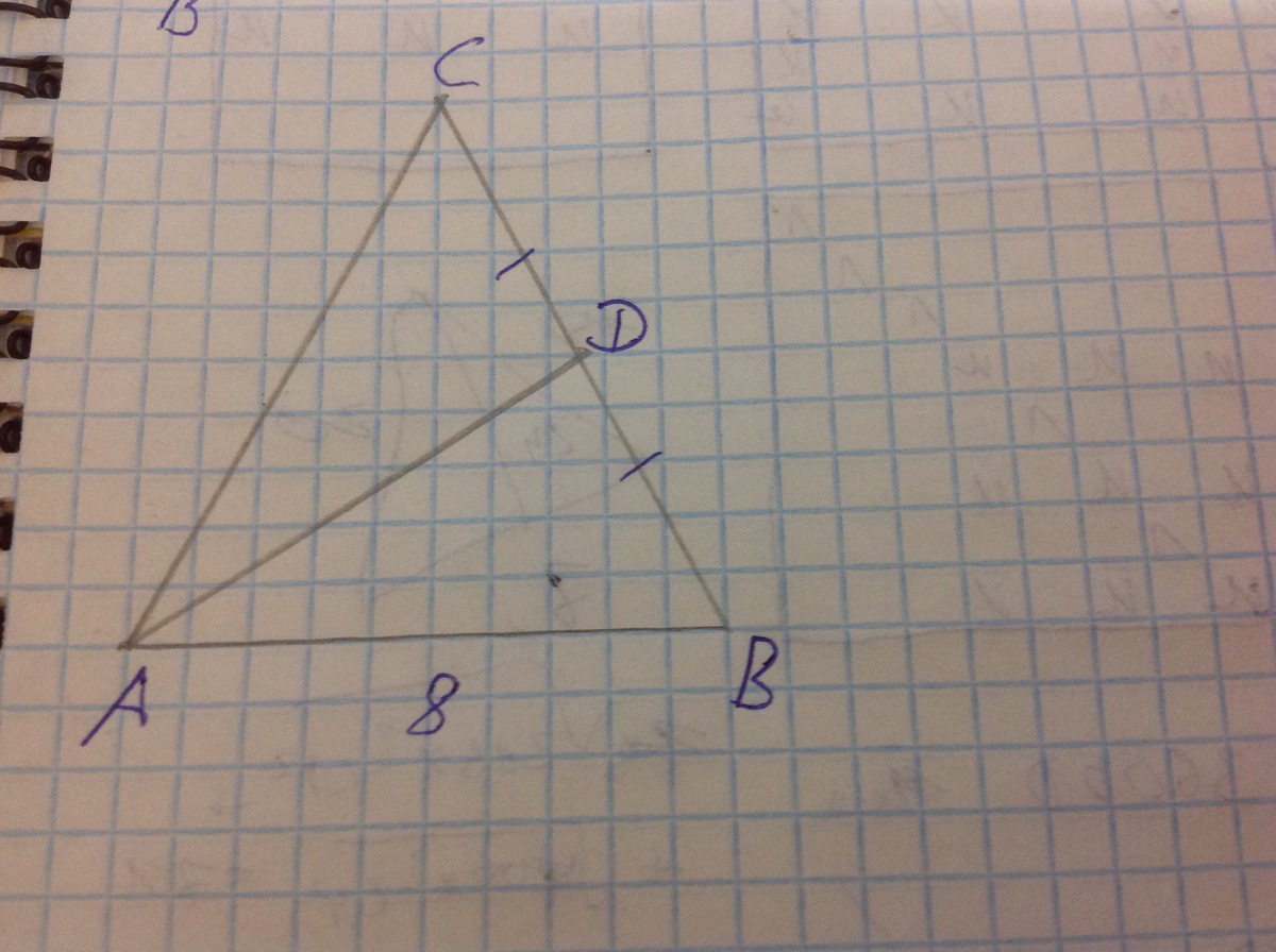 P(ACD)=AC+CD+AD, P(ABD)=AD+BD+AB, по условию, P(ACD)-P(ABD)=2, так как CD=BD, P(ACD)-P(ABD)=AC-AB. Таким образом, AC-AB=2, AB=8, тогда AC-8=2, AC=10.
