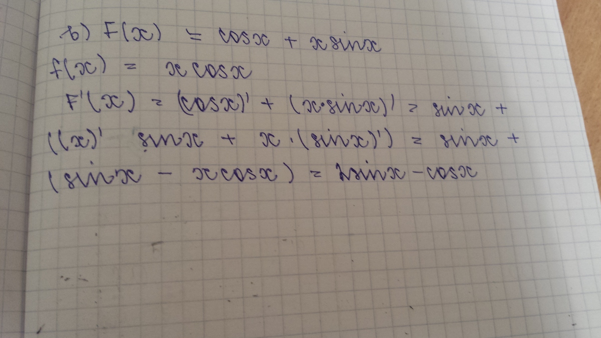 F(x)=cos x+xsin x\\F'(x)=(cos x)'+(x)'sin x+x(sin x)'=-sin x+sin x+xcos x=\\=boxed{xcos x}