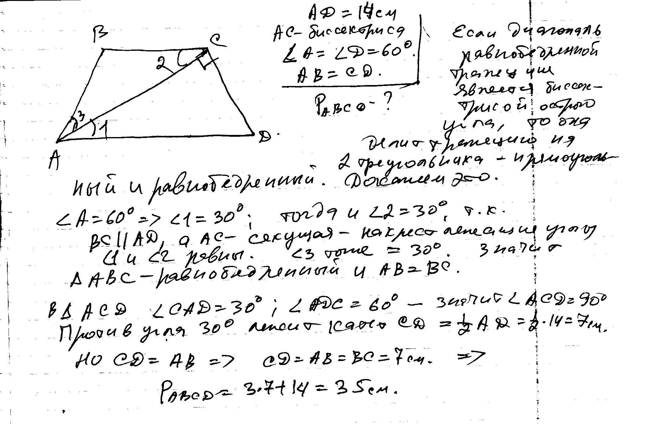 один из углов равнобедренной трапеции равен 60 градусов а диагональ трапеции делит этот угол пополам.Найдите периметр трапеции если ее большее основание равно 14 см