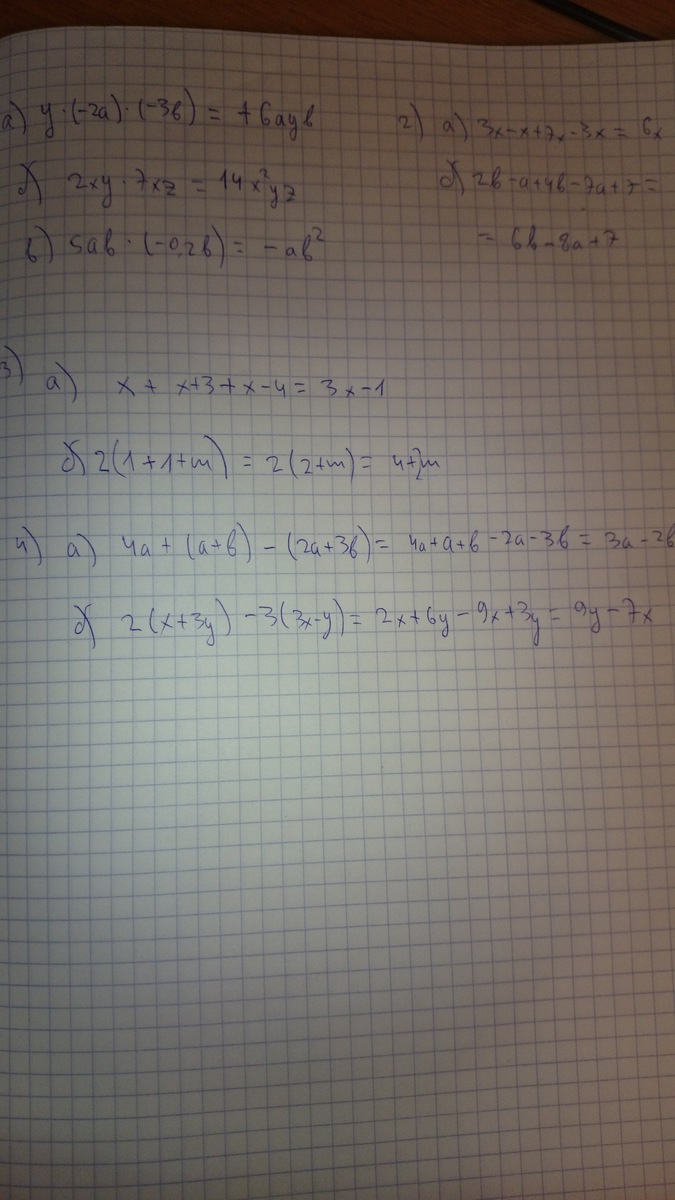 a)y*(-2а)*(-3b) b) 2xy*7xz в) 5ab*(-0,2b)