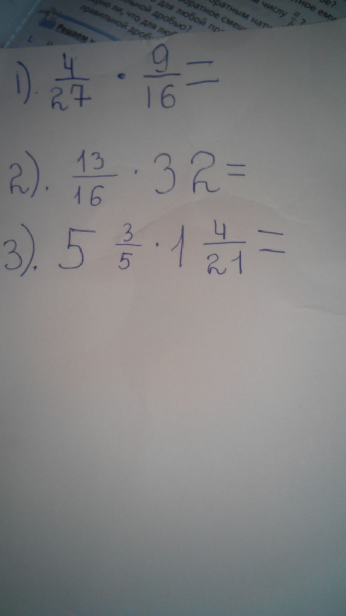 1) 4/27 * 9/16 = 1/3 * 1/4 = 1/12