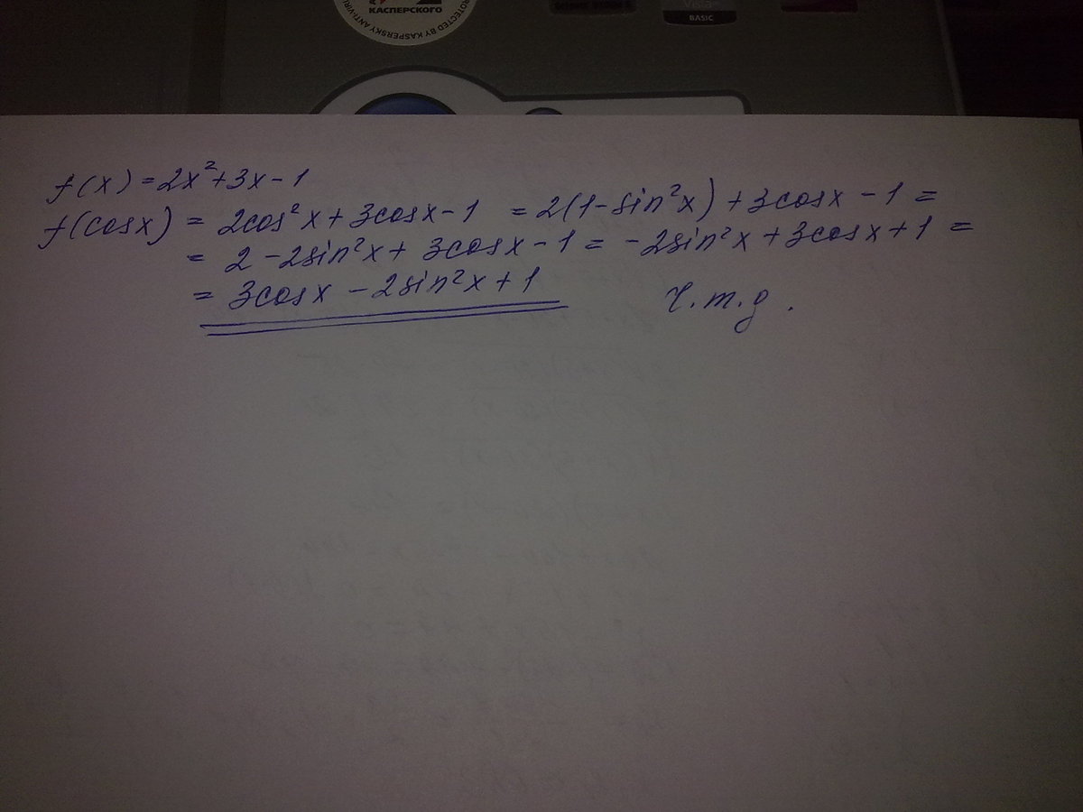 Тригонометрия+. Известно, что f(x)=2x^2 + 3x -1 Докажите, что f (cos x)= 3cosx - 2sin^2x +1, помогите пожалуйста