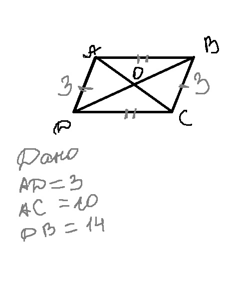 Итак, диагоали параллелограмма пересекаются и в точке пересечения делятся пополам. Нам надо найти ВОС. Противолежащие стороны параллелограмма равны, значит АД=ВС=3. ВО= половина ДВ, СО=половина АС. 14/2=7, 10/2=5. Периметр фигуры - сумма всех её сторон. Периметр ВОС = 5+3+7=15см