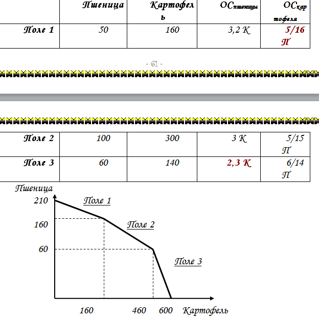 Фермер имеет три поля, каждое из которых однородно, хотя их урожайность неодинакова. Поля используются под картофель репу и пшеницу. На первом поле фермер может вырастить 20т картофеля либо 8т репы либо 4т пшеницы, на втором 12, 6 и 3 соответственно, а на третьем 9, 6 и 3 .Построить кривую производственных возможностей, если известно что репы обязательно надо вырастить ровно 6 т.
