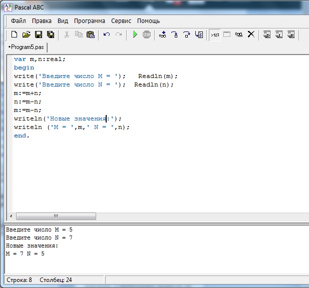 . Напишите программу в паскале, которая меняет местами значения целых переменных M и N без использования дополнительной переменной. Ниже представлен рекомендуемый вид экрана во время работы программы (данные вводимые пользователем выделены полужирным шрифтом).