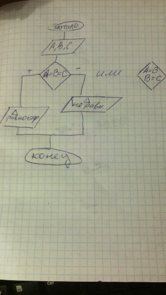 Как вариант. "Или" - разные преподаватели требуют по-разному. Как вариант еще сначала проверить А=В, если нет, то тр. не равн., если да, то проверять А=С, если нет, то тр. не равн., если да(и А=В, и А=С), то тр. равносторонний.
