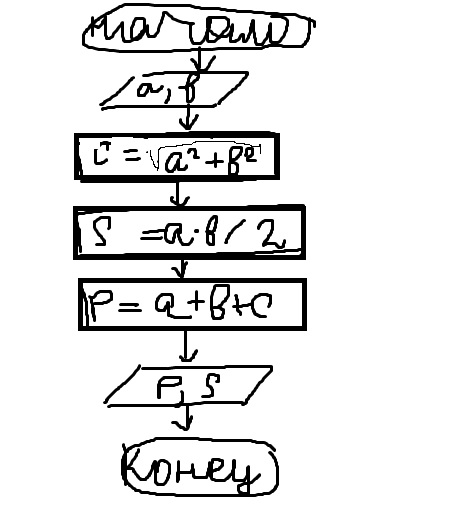Составьте блок-схему алгоритма вычисления периметра и площади прямоугольного треугольника по длинам двух его катетов