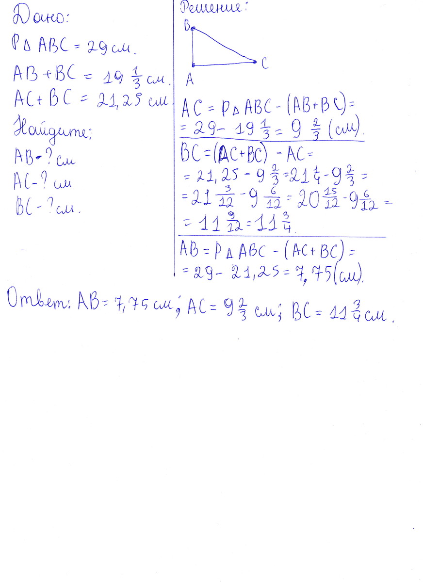 Помогите решить. Периметр треугольнмка АВС равен 29 см.Найдите стороны треугольника, если АВ+ВС=19 1/3 см,АС+ВС=21,25см. Спасибо.