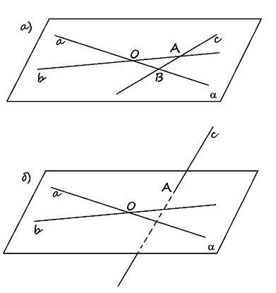 2) прямая тогда пересекает эту плоскость α в точке, которая лежит в α, но которая не принадлежит ни а, ни в прямой.
