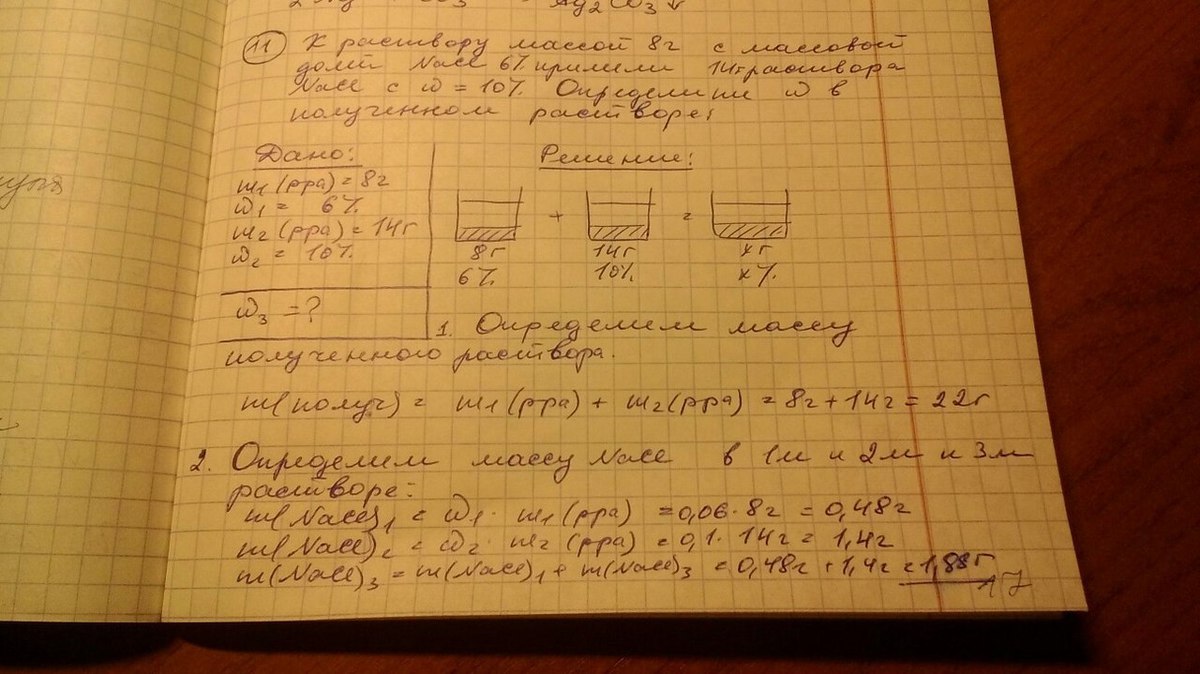 к раствору массой 8 г с массовой долей хлорида натрия 6% добавили раствор массой 14 г с массовой долей хлорида натрия 10%.Определите массовую долю NaCl в образовавшемся растворе.