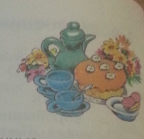 Когда я пришёл в гости к чаю, на столе увидел старый сервиз, большой торт, бутерброд с колбасой и букеты цветов.