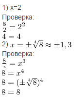 ![frac{8}{x}=x^3 \ 8=x^4 \ 8=(pm sqrt[4]{8})^4 \ 8=8 frac{8}{x}=x^3 \ 8=x^4 \ 8=(pm sqrt[4]{8})^4 \ 8=8](https://tex.z-dn.net/?f=+frac%7B8%7D%7Bx%7D%3Dx%5E3+%5C+8%3Dx%5E4+%5C+8%3D%28pm+sqrt%5B4%5D%7B8%7D%29%5E4+%5C+8%3D8)