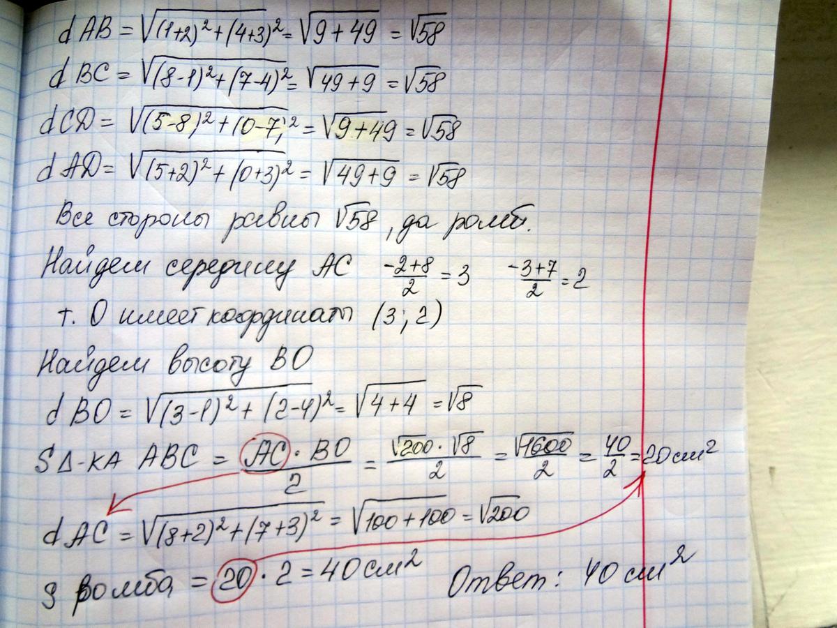 Докажите,что четырехугольник ABCD,вершины которого имеют координаты A(-2;-3),B(1;4),C(8;7),D(0,5),является ромбом.Найдите его площадь.