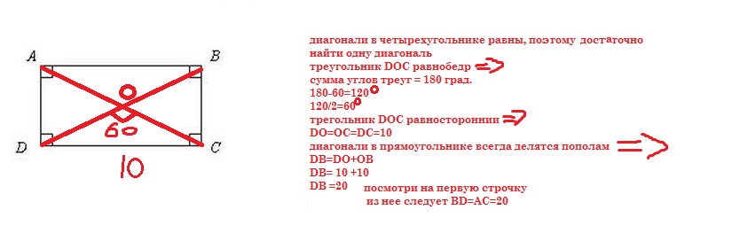 в прямоугольнике АВСD диагонали пересекаются в точке О, угол СОD = 60 градусов , СD= 10 см. Чему равны диагонали прямоугольника?