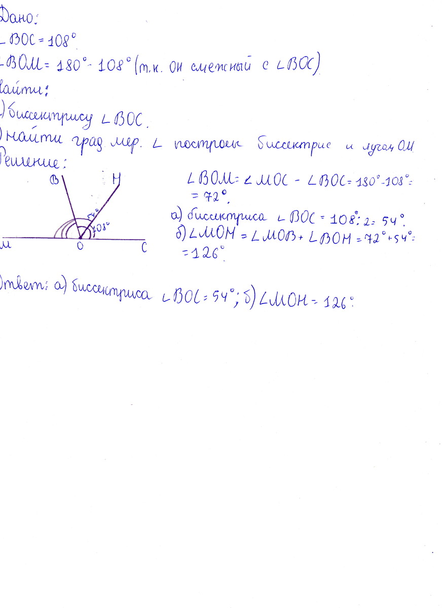 Начертите угол BOC, равный 108градусам, и смежный с ним угол BOM.