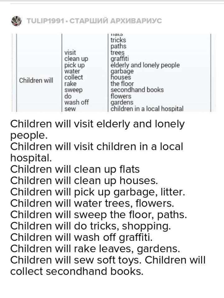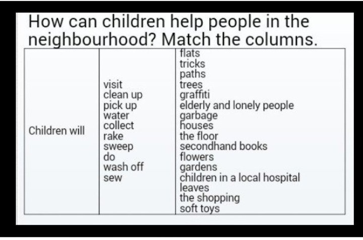 Vocabulary. How can children help people in the neighbourhood? Match the columns.
