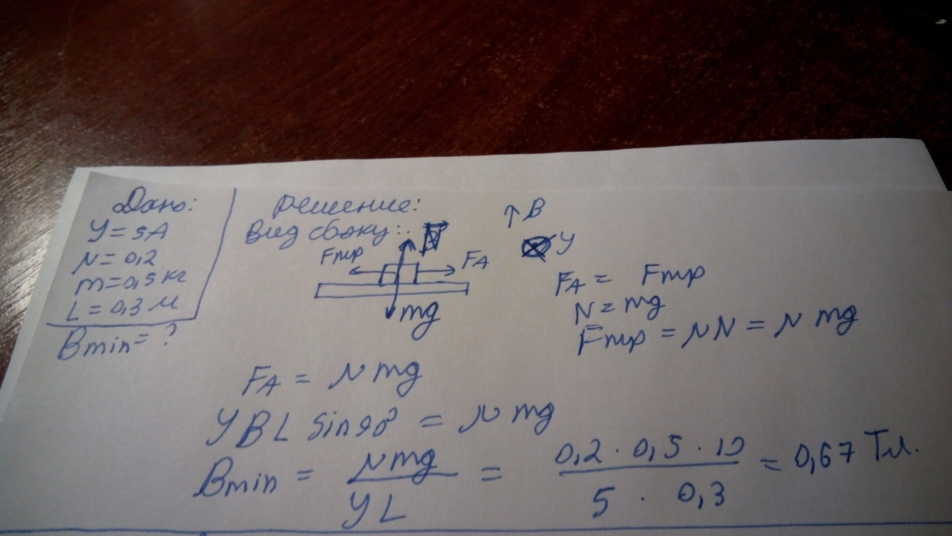 Горизонтальные рельсы находятся на расстоянии L = 0,3м друг от друга. На них перпендикулярно рельсам лежит стержень. Какой должна быть минимальная индукция магнитного поля, чтобы проводник двигался равномерно, если по нему пропускать электрический ток, Коэффициент трения стержня о рельсы M = 0,2. Масса стержня m = 0,5 кг, сила тока I = 5 А.