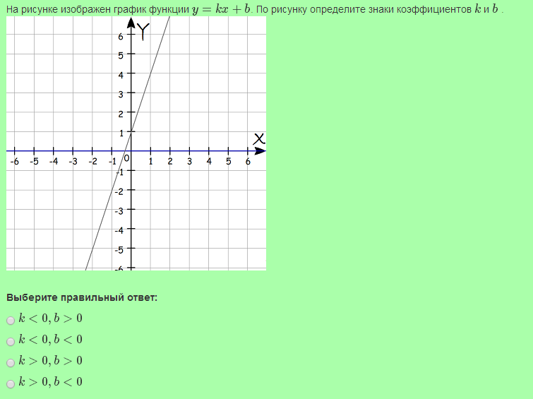 На рисунке изображен график функции y=kx+b. По рисунку определите знаки коэффициентов k и b .