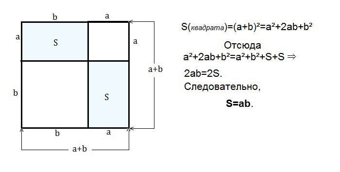 В то же время площадь этого достроенного квадрата состоит из суммы площадей двух меньших квадратов, чьи площади равны а² и b², и площадей двух прямоугольников со сторонами а и b, чью площадь мы приняли равной S.