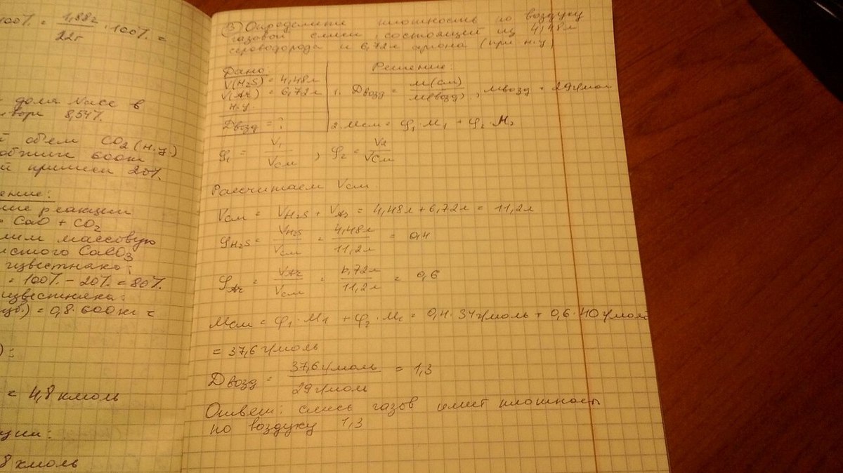 Определите плотность по воздуху газовой смеси, состоящей из 4,48 л сероводорода и 6,72 л агрона (при н.у).