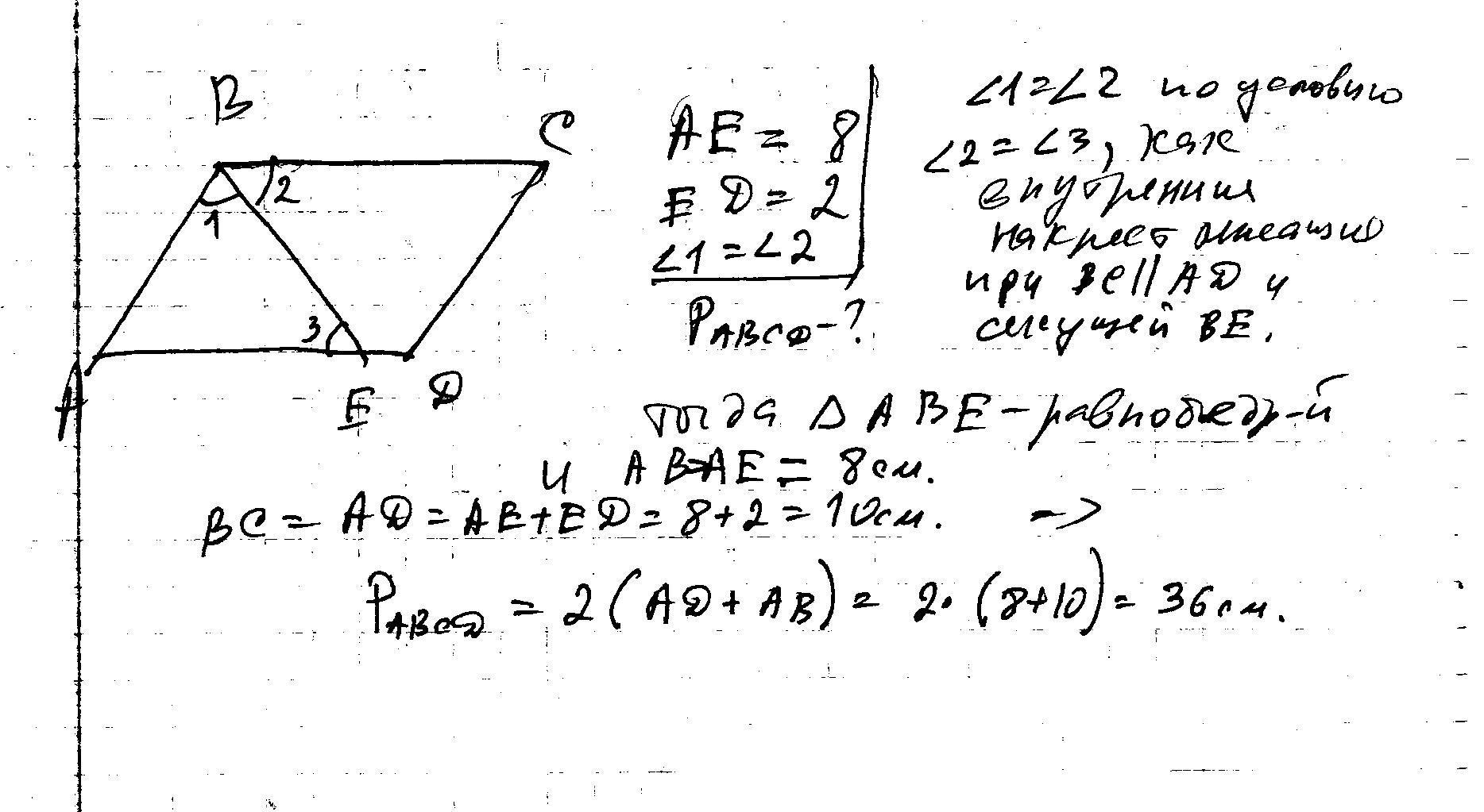 Дано: ABCD -параллелограм,ВЕ-биссектриса угла АВС, АЕ=8 см.,а ЕD=2 см. Найти:периметр параллелограмма