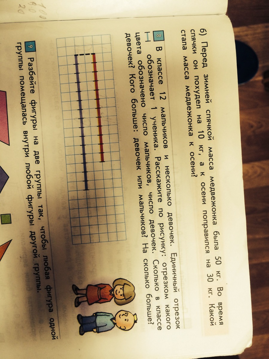 Красный отрезок - число мальчиков, синий - число девочек. В классе 15 девочек. Девочек больше чем мальчиков на 3 человека.