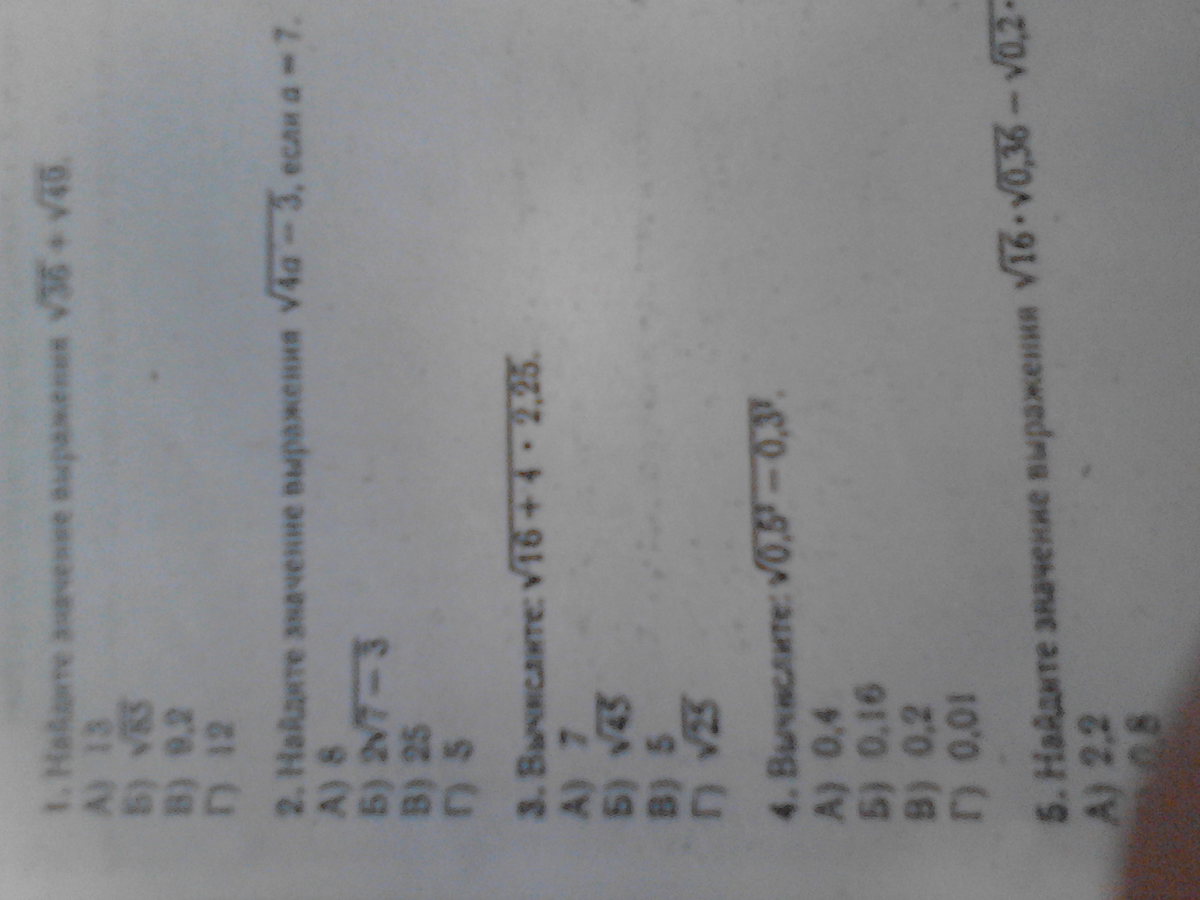1)sqrt{36}+sqrt{49}=6+7=13\2)sqrt{4*7-3}=sqrt{25}=5\3)sqrt{16+4*2,25}=sqrt{16+9}=sqrt{25}=5\4)sqrt{0,5^2-0,3^2}=sqrt{0,2*0,8}=sqrt{0,16}=0,4