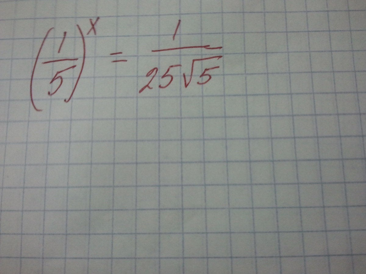 (frac{1}{5})^x= frac{1}{25 sqrt{5}} \(frac{1}{5})^x= frac{1}{5^2*5^{frac{1}{2}}} \(frac{1}{5})^x= frac{1}{5^{frac{5}{2}}} \(frac{1}{5})^x= (frac{1}{5})^{frac{5}{2}}} \ x= frac{5}{2}
