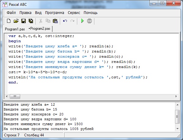 В день группа туристов покупает 10 буханок хлеба по А рублей,. 5 батонов по В тенге, 10 шт консервов по С рублей,. ведро картошки за Д рублей на оставшиеся деньги они приобретают другии продукты