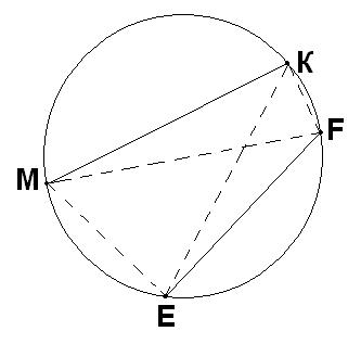 Вписанные углы MFE и МКЕ равны 45, так как опираются на одну дугу МЕ. Также вписанные углы EFK и ЕMK равны 100, так как опираются на одну дугу EK. Из треугольника МЕК найдем угол МЕК = 180- угол ЕМК - угол МКЕ=180-100-45=35.