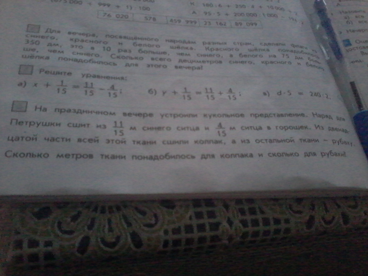 11/15+4/15=15/15 = 1 м - это вся ткань
