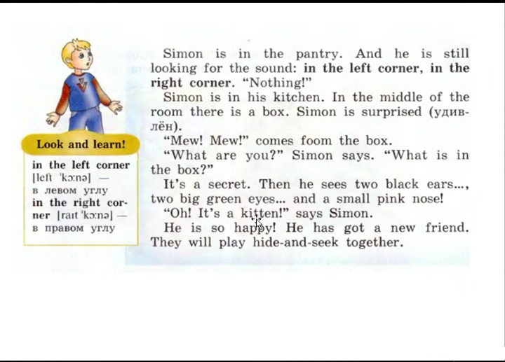 Саймон на кухне. В середине комнаты находится коробка. Саймон удивлен. "Мяу !Мяу !" издается из коробки. "Кто ты ?" говорит Саймон. "Что в коробке? " Это секрет.(Остается секретом) . Затем он видит два черных уха, два больших зеленых глаза и маленький розовый носик . "Оу !" Это котенок !" говорит Саймон. Он так счастлив ! У него есть новый друг. Они будут играть в прятки вместе.