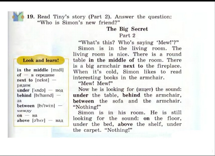 Что это ? Кто говорит "Мяу "? Саймон (находится ) в гостиной. Она приятная. В середине комнаты есть (расположен) круглый стол. Рядом с камином находится большое кресло. Когда бывает холодно, Саймон любит читать интересные книги , сидя в кресле у камина. "Мяу !Мяу !"