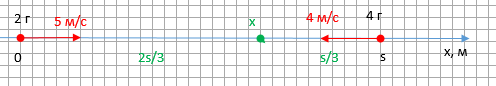 Две частицы с массами 2г и 4г движутся на встречу друг к другу вдоль оси ОХ со скоростью 5 м/с и 4м/с соответственно. Чему равно проекция скорости центра масс системы на ось ОХ?