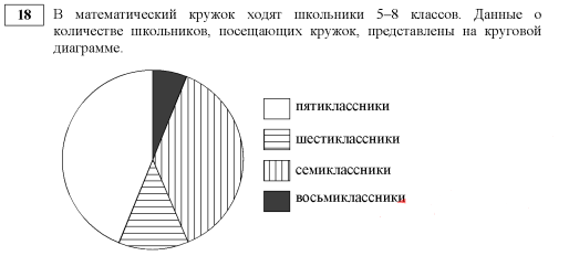 В математический кружок ходят школьники 5–8 классов. Данные о количестве школьников, посещающих кружок, представлены на круговой диаграмме.