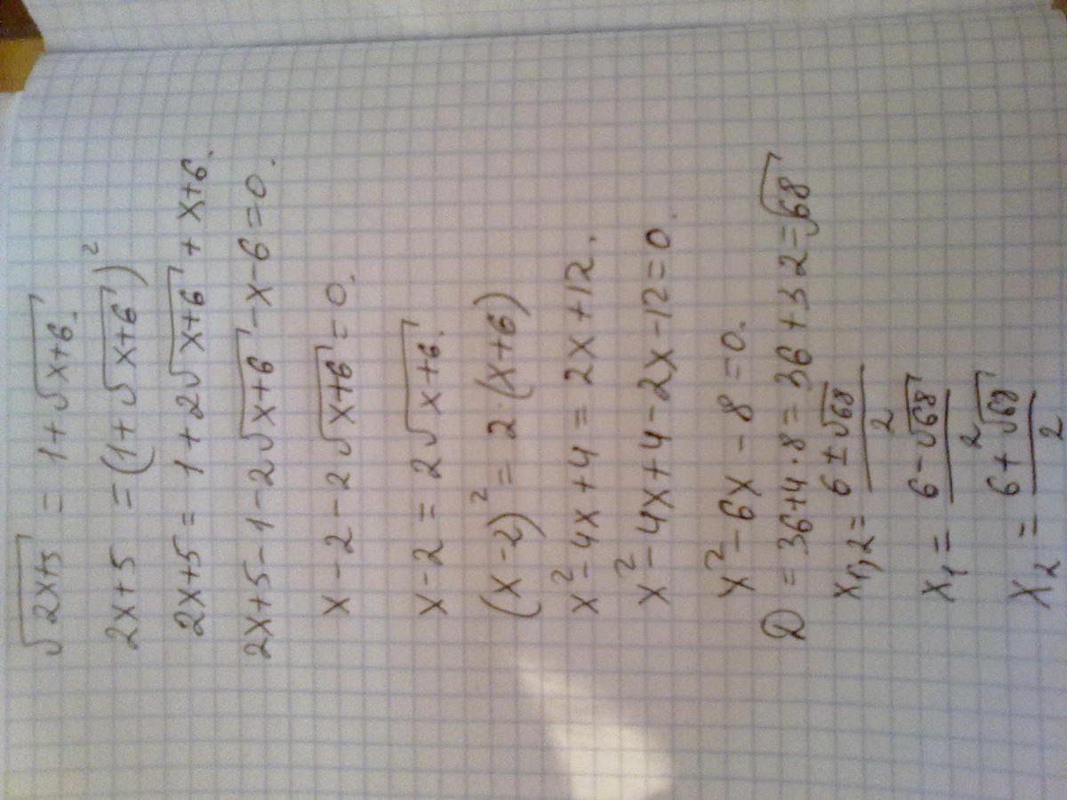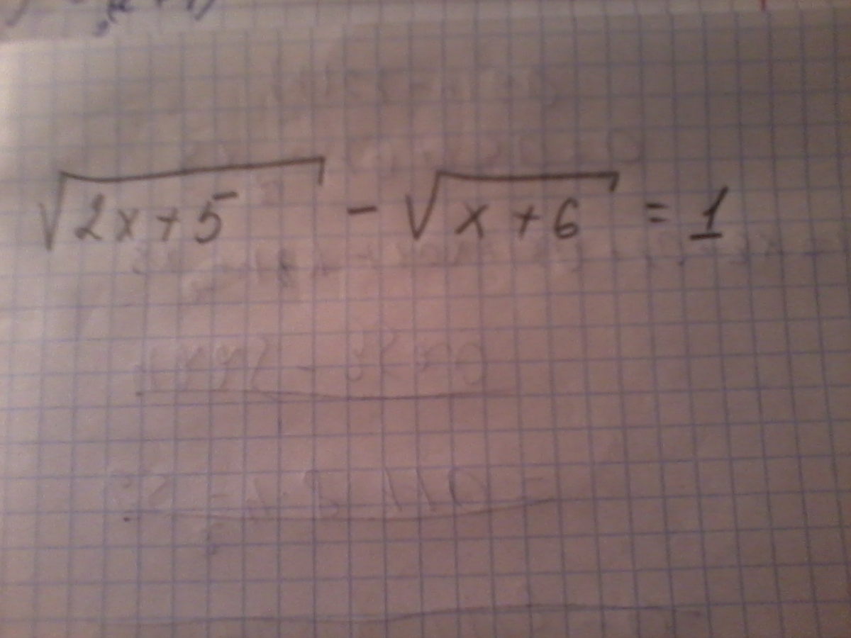 Ребят помогите решить ,объясните как решать √2х +5-√х+6 =1 это иррациональное уравнение (корень из выражения 2x+5 - корень из выражения x+6 =1 )Возвожу в квадрат и не получается(