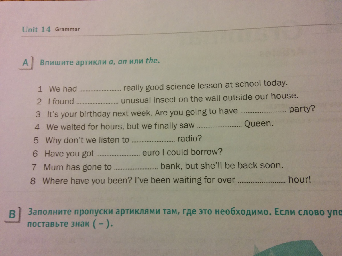 Впишите артикли a,an или the [в (А)], а в (B) заполнителя пропуски артиклями там, где это необходимо. Если слово употребляется без артикля, поставьте знак(-)!!! СРОЧНО !!!