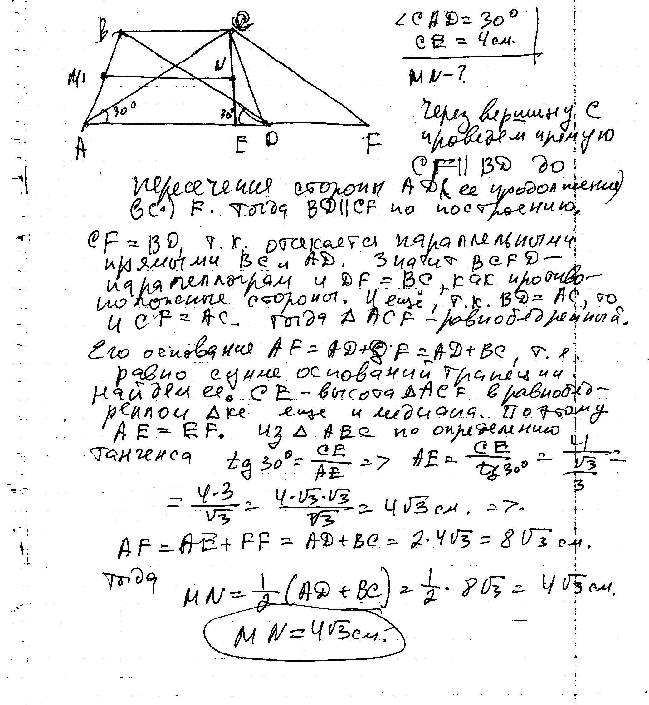в равнобедренной трапеции диагональ составляет с основанием угол в 30 градусов а ее высота равна 4см.найдите среднюю линию.