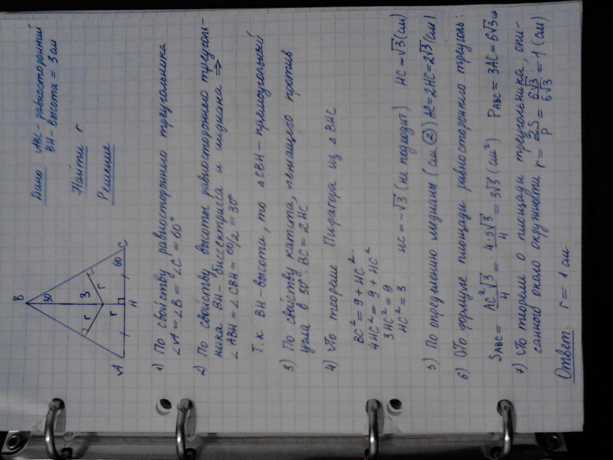 Высота равностороннего треугольника равна 3 см. Найдите радиус описанной около него окружности и радиус вписанной в него окружности. Пожалуйста с чертежом)
