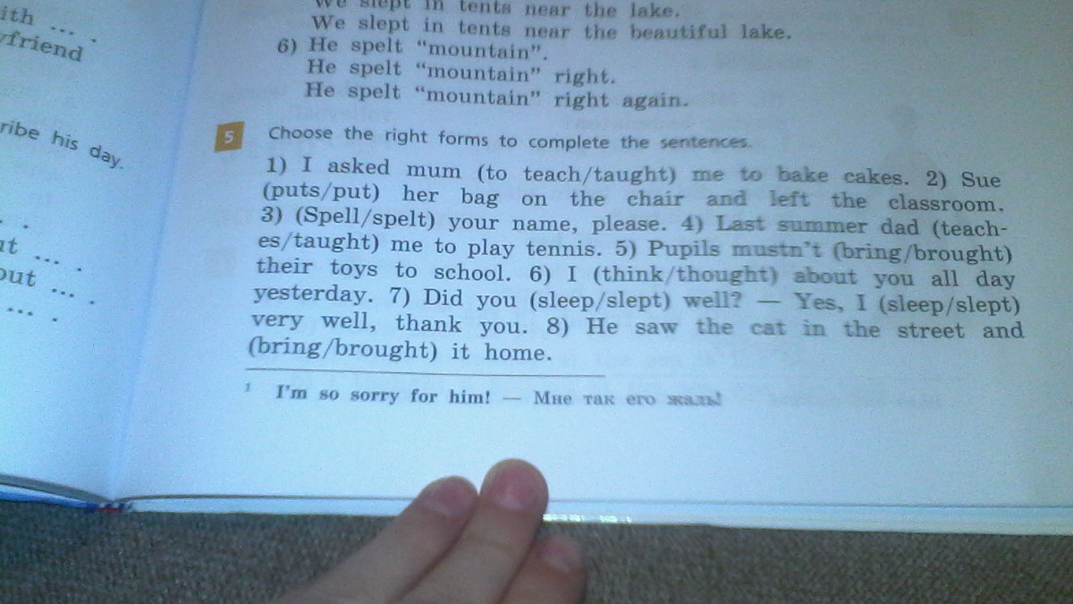 я попрасила у мамы, чтобы она научила меня стряпать пирог. она поставила свою сумку на стол, и покинула класс. Произнести по буквам своя имя пожалуйста. прошлое лето папа меня научил играть в теннис.