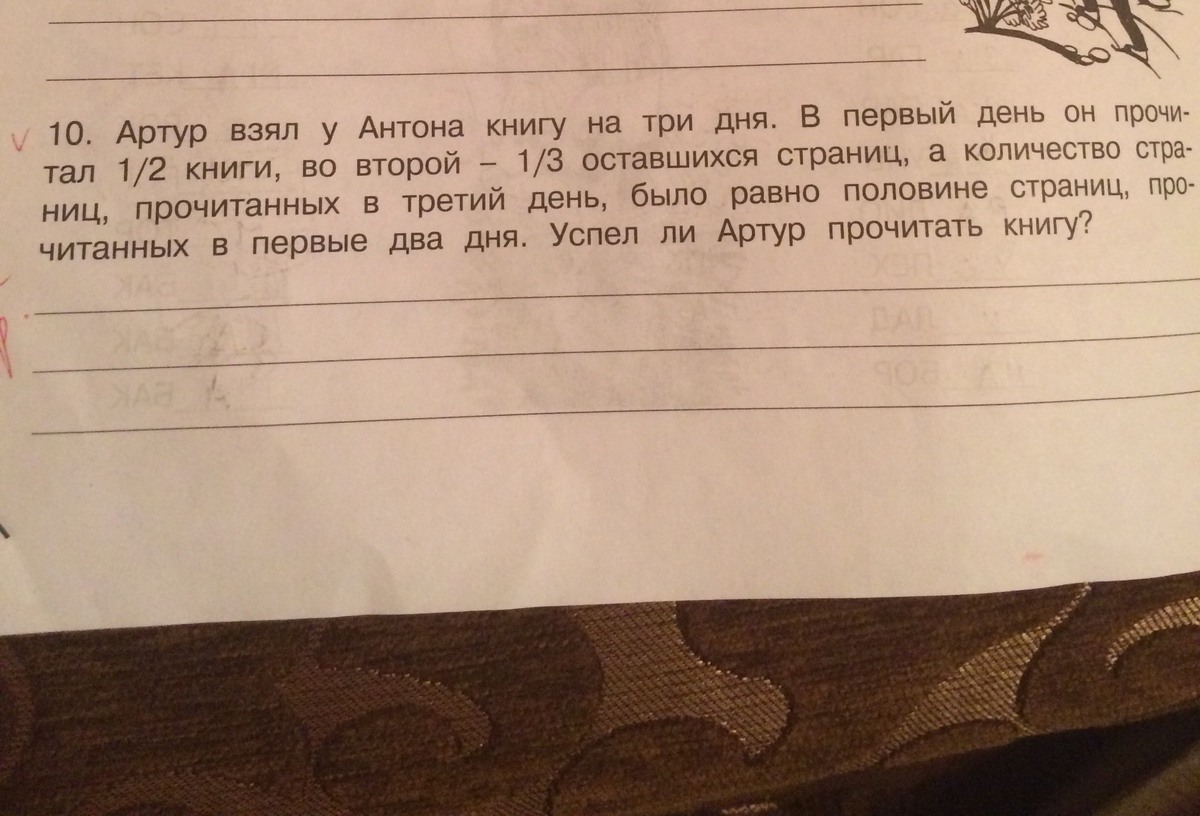 Артур взяла у Антона книгу на три дня.В первый день он прочитал 1/2 книги,во второй-1/3 оставшихся страниц,а количество страниц,прочитанных в третий день,было равно половине страниц,прочитанных в первые два дня.Успел ли Артур прочитать книгу?Попробуйте пожалуйста решить если в книге 120 страниц