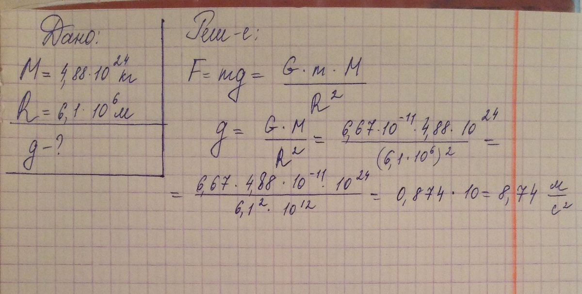 Определите ускорение свободного падения на поверхности Венеры если ещё масса 4,88*10^24 кг а радиус 6,1*10^6 м.